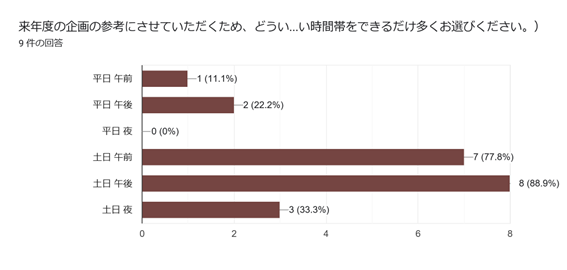 来年度の企画の参考にさせていただくため、どういった曜日時間帯であればご参加しやすいか、ご希望をお聞かせください。